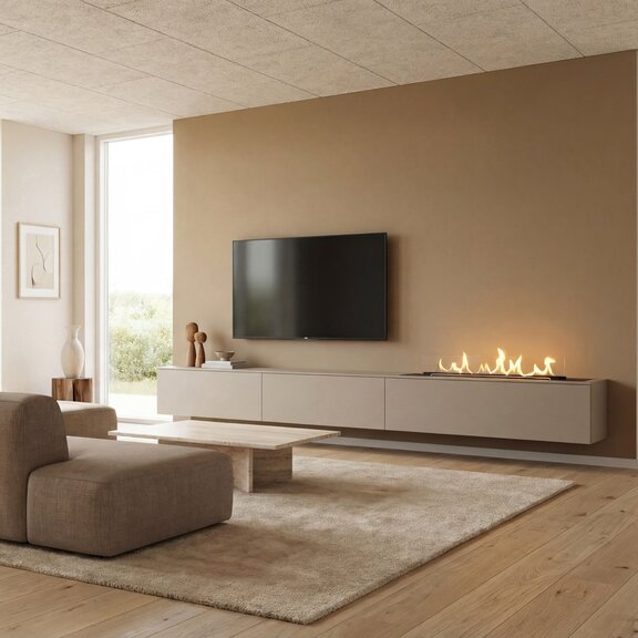 Der Bioethanol-Brenner ist in drei Standardgrössen von 520 bis 1120 mm erhältlich und lässt sich flexibel in individuelle Wohnkonzepte integrieren.