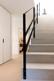 Wer die Sichtbetontreppe hinaufsteigt, läuft direkt auf den Kaminofen zu. Durch seine zentrale Positionierung verbindet er Küche, Ess- und Wohnbereich visuell miteinander.