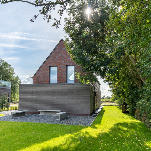 Heimischer Klinker aus einem Wittmunder Werk, unbehandeltes Lärchenholz und massgefertigte Einbaumöbel regionaler Handwerker prägen das Erscheinungsbild.